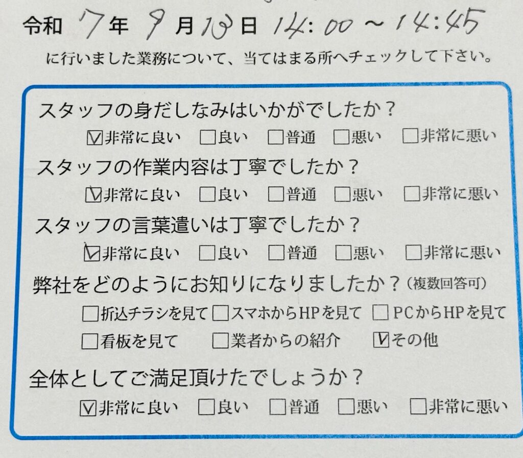 「埼玉県蓮田市 片付け・不用品回収 S様」 2025.09.24 お客様の声 目次 利用サービス お客様の声 担当者より 利用サービス 片付け・不用品回収 お客様の声 お世話になりました。 おかげさまで大変助かりました。 またよろしくお願いいたします。 担当者より この度はご利用いただきありがとうございました。 少しでもご助力できたこと嬉しく思います。 またのご利用お待ちしております。